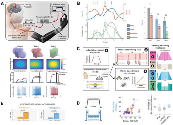 Human studies on biomimetic tactile feedback in upper-limb (A–D) and lower-limb (E) neuroprosthetics. (A) Biologically inspired prosthesis system. Neuromorphic (i.e., mimicking biological structure and function) tactile sensors combined with biomimetic (i.e., mimicking biological processes and signals) neuron models provided specific responses that corresponded to different objects. Adapted from [63]. (B) Biomimetic encoding strategies outperformed non-biomimetic sensory stimulation during object size and compliance discrimination tasks. * p < 0.05. Adapted from [64]. (C) Implemented and compared sensory encoding strategies, including amplitude neuromodulation (ANM), frequency neuromodulation (FNM), and hybrid neuromodulation (HNM). Adapted from [65]. (D) Biomimetic ICMS resulted in improved sensitivity of the electrode with reduced just-noticeable differences (JNDs) and higher resolution force feedback compared with non-biomimetic stimulation. Adapted from [47]. (E) Biomimetic stimulation provided more natural tactile perception (rated from 0: totally unnatural to 5: totally natural) in both participants with lower-limb amputations. Adapted from [68]. All figures were reprinted with permissions.