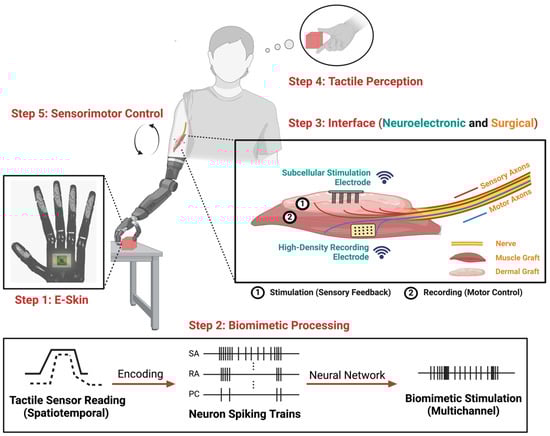 Next-generation neuroprosthetics that integrate biomimetic tactile feedback shown in steps. Flexible, electronic skin (e-skin) converts captured tactile data into biologically relevant outputs through biomimetic circuit designs. The tactile information is then processed using encoding strategies and neural networks to create multichannel biomimetic stimulation patterns. Subcellular-scale stimulation electrodes provide the precision needed to target individual neurons, selectively activating the sensory fiber populations responsible for conveying specific tactile information in response to the tactile stimuli. Meanwhile, high-density recording electrodes allow for improved decoding of motion intent. A surgical construct that biologically separates motor and sensory axons within the peripheral nerve provides optimal access to mechanoreceptors, facilitating accurate and naturalistic biomimetic tactile feedback.