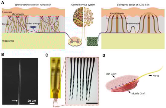 In 2024, Liu et al. introduced a groundbreaking electronic skin known as three-dimensionally architected electronic skin (3DAE-Skin) [90]. This design comprises three layers that structurally mimic the epidermis, dermis, and hypodermis, with thickness and elastic properties comparable with those of human skin. Additionally, its sensing components are arranged in a 3D configuration, replicating the spatial distribution of Merkel cells and Ruffini endings found in natural skin (Figure 3A) [90]. Functionally, 3DAE-Skin enables decoupled sensing of the normal force or shear force and the strain, closely resembling the specific roles of human mechanoreceptors. Its resistive sensors generate continuous signals in response to sustained stimuli, similar to the behavior of slowly adapting receptors in human skin. The researchers demonstrated that 3DAE-Skin achieves a spatial resolution for force sensing (0.117 mm) comparable with that of the human hand. Moreover, it can simultaneously detect an object’s elastic modulus and local principal curvature components through touch, similar to human tactile perception [90]. Advancements like 3DAE-Skin and other skin electronics developed by researchers at both Northwestern University [91,92,93] and Stanford University [94,95,96,97] represent a significant step forward in e-skin technology. These developments will accelerate the integration of e-skins with embedded biomimetic circuits [98] or models in commercial sensorized neuroprosthetic limbs, ultimately accelerating the clinical translation of neuroprosthetics with naturalistic somatosensory feedback [12,62].
