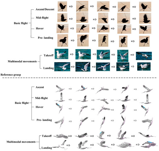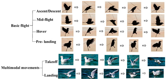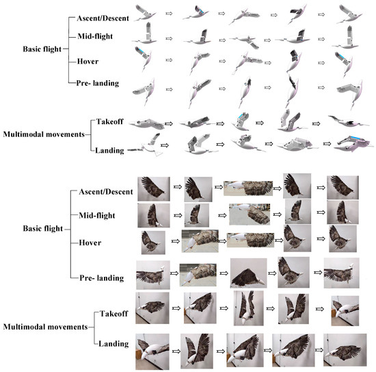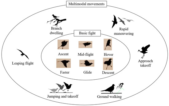 Apart from fundamental flight maneuvers like level flight, ascending, fast flight, hovering, leaping, and landing, birds also display multimodal movements, which enhance their ability to respond to different environmental demands. For example, to expand their habitat, they retain the ability to take off and land; to reduce energy consumption and increase flight duration, they adopt intermittent flapping-gliding flight patterns; and to evade predators, they have evolved highly maneuverable flight capabilities [20]. The multimodal movement patterns of birds are illustrated in Figure 1.