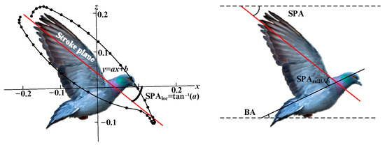 The stroke plane angle (SPA) is the angle associated with the gradient of the linear regression line calculated from the wingtip’s x and z positional coordinates relative to the shoulder. SPArelBA refers to the SPA relative to the body angle (BA). The flight postures and motion characteristics of pigeons at different stages are shown in Figure 3. Figure 3 is based on the work in reference [30].