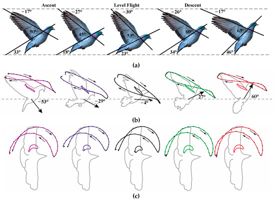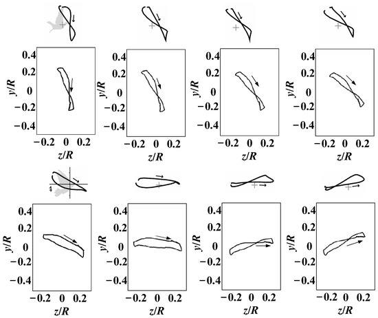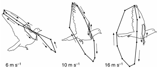 In addition, the flight posture of pigeons is also related to flight speed. The wingtip trajectories of pigeons under varying flight speeds are presented in Figure 5 [32].
