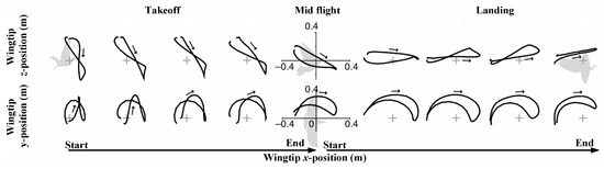 Figure 3c shows the dorsal view of the wingtip and wrist kinematics. It illustrates that during ascent, descent, and level flight at different angles, the motion trajectories of the wingtip and wrist in the dorsal plane are quite similar. In all flight phases, the wingtip follows a figure-eight motion trajectory. Kinematic traces for the takeoff, mid-flight, and landing of the pigeon are shown in Figure 4.