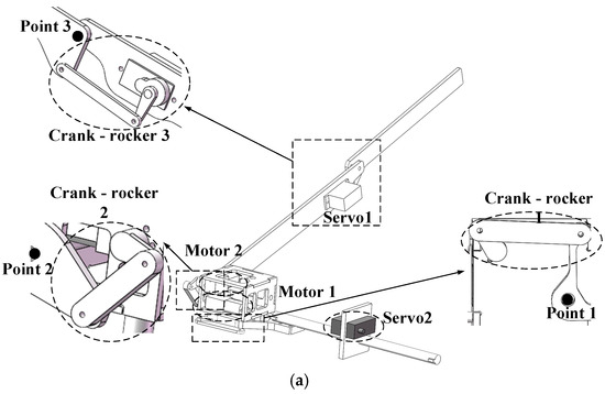 Sweeping is realized by the coordinated operation of Motor 2 and Crank-Rocker 2. The output shaft of Motor 2 is connected to the sweeping shaft, driving the crank’s rotation. This motion is transmitted via the rocker. With point 2 fixed to the flapping wing, the rocker’s swing facilitates the wing’s rotation around the y-axis, enabling the sweeping motion.