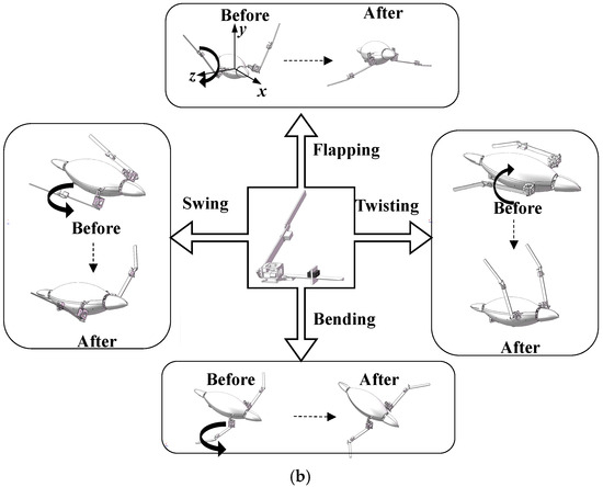 Referring to the primary postures involved in basic flight and multimodal movements of birds, the corresponding postures achieved by the attitude transformation mechanism are depicted in Figure 7. The following explains the process of achieving the main postures of the attitude transformation mechanism.
