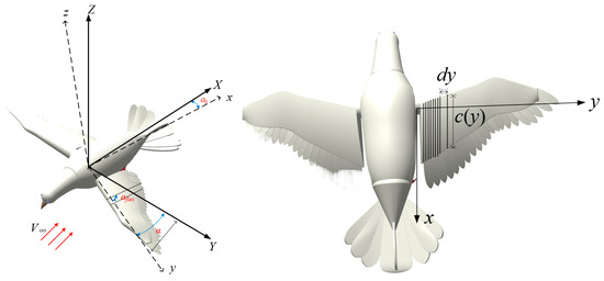 To calculate the required torque for the robotic bird, it is first necessary to estimate the aerodynamic forces generated during flapping. The estimation of flapping wing aerodynamic forces was performed using quasi-steady aerodynamic laws, which provide a balance between simplicity and computational efficiency. These laws are widely used in bio-inspired robotics for their ability to approximate lift and drag forces during steady flapping motion with reasonable accuracy. Using the quasi-steady method proposed in reference [34], the aerodynamic forces are calculated, taking spanwise deformation into account. The body coordinate system and the segmentation of the flapping wing into strip elements are shown in Figure 8, where α represents the flapping angle, α0 is the initial installation angle, and αflex denotes the spanwise deformation angle.
