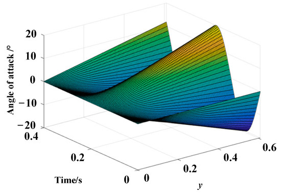 Assuming an initial angle of attack of 0°, a flapping frequency of 4 Hz, a maximum flapping angle of 60°, and a maximum deformation angle of 20°, the actual flight angle θ as a function of spanwise coordinate y and time t can be obtained, as illustrated in Figure 9. According to the simulation results, the actual angle of attack is minimal at the wing root, equal to the sum of the initial angle of attack and the initial installation angle. As the spanwise coordinate increases, the actual angle of attack gradually increases, reaching its maximum at the wingtip.