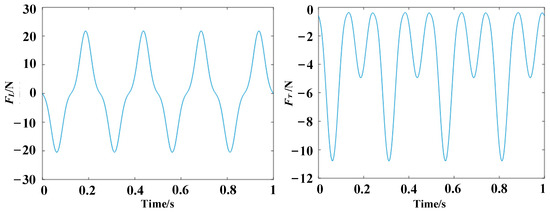 From Figure 10, it is determined that the maximum aerodynamic force generated by the flapping wing is approximately 22 N. The mass of a single wing is 50 g, and by taking the geometric center of the wing as the point of action, the torque required for flapping the wing is calculated as shown in Equation (21).