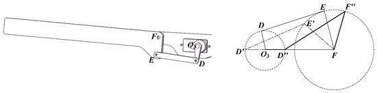 When the crank O3D serves as the driving component and rotates clockwise around point O3 (0, 0) at an angular velocity of w0, traversing an angle of w0t, the crank-rocker mechanism will, based on mechanical principles, reach two extreme positions: O3D’E’F (limit one) and O3D″E″F (limit two), as depicted in Figure 13.