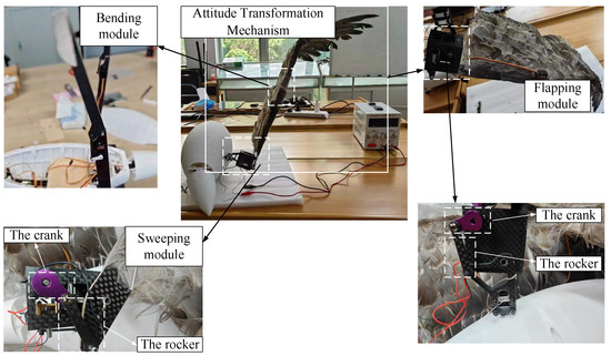 As shown in Figure 7, the robotic bird equipped with the attitude transformation mechanism can simulate both the basic flight postures of birds and fulfill the requirements for flapping wing movement in multimodal movements.