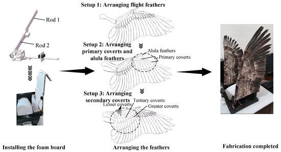 The flapping wing design methodology and process, as shown in Figure 15, begins by installing foam boards on the main rods 1 and 2 of the flapping wing module. Then, based on the arrangement of bird feathers, feathers (duck feathers) are arranged on the foam boards. The result is a bio-inspired flapping wing.