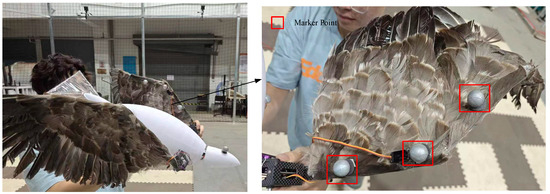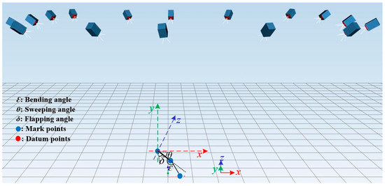 To monitor important spatial points during the operation of the attitude transformation mechanism, fluorescent balls are installed at key positions. Following the measured motion parameters, fluorescent balls are placed along the wing’s leading edge. One is located at the center of the wing, another is at the junction between the first and second wing sections, and the last one is at the center of the second wing section, as depicted in Figure 17. To minimize the potential errors caused by scattering in the use of fluorescent balls for position tracking, several measures were implemented. First, the fluorescent balls were coated with a high-quality retroreflective material to maximize light return to the cameras and reduce diffuse reflection. Second, the NOKOV-Mars motion capture system was equipped with infrared cameras and optical filters specifically targeting the wavelength of the reflected light, thereby reducing interference from ambient light and scattering. Third, the experimental environment was carefully controlled to minimize ambient light and reflective surfaces. Finally, the system was calibrated using a calibration wand with known dimensions, and an error correction model was applied during data post-processing to compensate for any residual scattering effects. These measures ensured that the positional tracking accuracy remained within an acceptable range, with a maximum error of less than 1 mm. The motion parameters are measured by means of the Xingying 1.4.0.x software. This measurement system offers a distance accuracy of 1 mm and an angular measurement error of ±1°.