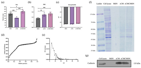 Characteristics of NPs: (a) size of NPs, (b) PDI of NPs, (c) zeta potential of NPs, (d) BET diagram of MSN, (e) BJH diagram of MSN, (f) SDS-PAGE protein separation, and (g) the presence of the cardiac cell membrane protein cadherin as shown in a Western blot. * p < 0.05, ** p < 0.01, *** p < 0.001.