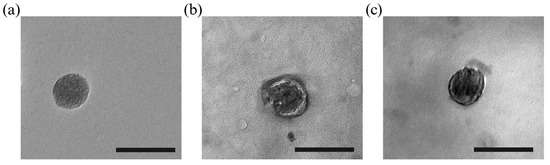 TEM images revealed the particle shape, showing that MSNs were originally porous spherical particles extracted using CTAB (Figure 2a) [29]. Cardiomyocytes were used to create the vesicles, which displayed a round shape and a double-layered membrane characteristic of the cCM (Figure 2b). The cCMCMSNs presented its spherical shape by incorporating MSN into the cCM structure (Figure 2c). The thick edge might indicate enhanced structural integrity and increased stability, which is essential to preserving the functionality of NPs when they interact with biological systems. In this study, we obtained the full coating of cCMCMSNs and found a partial coating of cCMCMSNs using TEM. The shell integrity of the re-assembled cell membrane coatings can be quantitatively assessed to determine shell integrity using a fluorescence quenching assay, as investigated by Liu et al. They employed fluorescent nitro-2,1,3-benzoxadiazol-4-yl (NBD) labelling of NPs and treated them with dithionite (DT). Their findings revealed that fully coated NPs retained fluorescence after the addition of the DT quencher, indicating intact coatings. Conversely, if the NPs were only partially coated or completely uncoated, the fluorescence intensity diminished gradually due to the reduction of the NBD dye by DT, highlighting the relationship between coating integrity and cellular internalisation potential [27]. However, we did not measure the shell integrity of the re-assembled cell membrane coatings because partially coated NPs could provide the ability for cell internalisation through the presentation of protein and receptor on cell membranes [30].