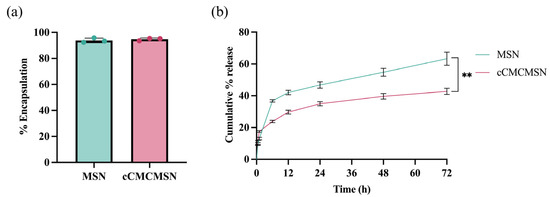 The RhB encapsulation and release profiles of MSNs and cCMCMSNs: (a) percentage of encapsulation of RhB, and (b) cumulative percentage of RhB release within 72 h. ** p < 0.01.