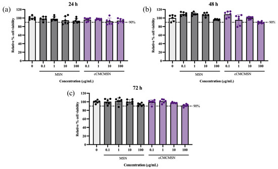 The cytotoxicity of MSNs and cCMCMSNs was determined using AC16 cells (Figure 4). The result showed that MSNs at concentrations of 0.1, 1, 10, and 100 µg/mL showed 98.26 ± 4.92%, 98.24 ± 5.14%, 94.67 ± 9.10%, and 93.79 ± 5.55% cell viability, respectively, at 24 h. cCMCMSNs at concentrations of 0.1, 1, 10, and 100 µg/mL showed 96.19 ± 4.19%, 97.16 ± 1.75%, 92.11 ± 7.87%, and 93.83 ± 4.56% cell viability, respectively, at 24 h. There were no significant differences in cell viability for both MSNs and cCMCMSNs at every concentration when compared to that of the control group (100.00 ± 4.30%). MSNs showed 109.30 ± 4.24%, 109.80 ± 3.50%, 107.80 ± 4.22%, and 96.28 ± 1.24% cell viability, respectively, at 48 h. cCMCMSNs showed 108.60 ± 7.19%, 95.54 ± 12.10%, 100.10 ± 3.02, and 89.42 ± 2.461% cell viability, respectively, at 48 h. There were no significant differences in cell viability for both MSNs and cCMCMSNs at every concentration when compared to that of the control group (100.00 ± 7.23%). MSNs showed 100.40 ± 6.34%, 101.80 ± 7.43%, 100.10 ± 5.23%, and 93.61 ± 3.24% cell viability, respectively, at 72 h. cCMCMSNs showed 99.26 ± 5.28%, 101.20 ± 4.48%, 97.59 ± 1.20%, and 91.35 ± 2.95% cell viability, respectively, at 72 h. There were no significant differences in cell viability for both MSNs and cCMCMSNs at every concentration when compared to that of the control group (100.00 ± 3.51%). cCMCMSNs exhibited low toxicity to cardiac cells within 72 h of treatment.