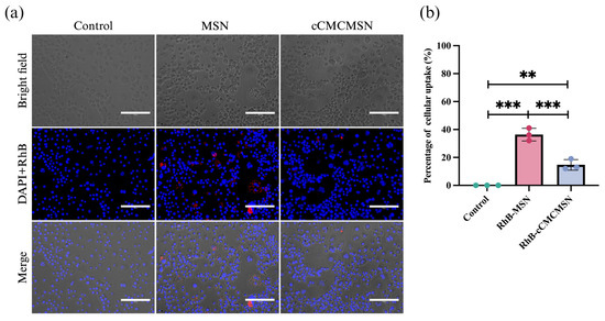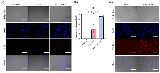 Cellular uptake of RhB-loaded NPs by AC16 cells: (a) cellular uptake of MSNs and cCMCMSNs; (b) percentage of cellular uptake (scale bar = 300 µm, *** p < 0.01); (c) cellular uptake of PHK26-stianed cCMCMSNs in AC16 cells (scale bar = 150 µm).