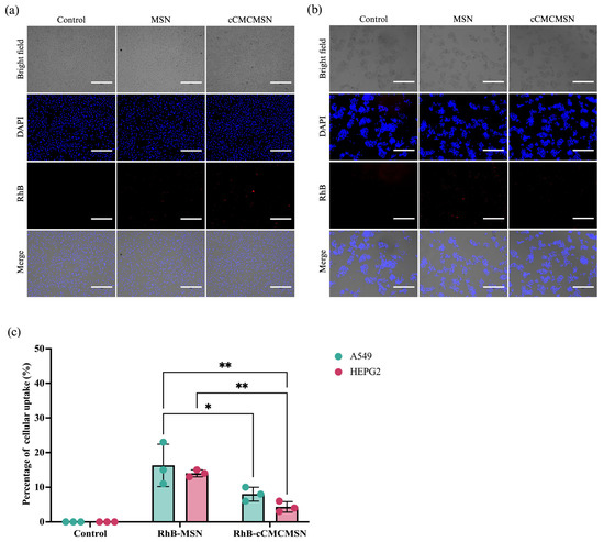 Specificity of cCMCMSNs for A549 and HEPG2: (a) internalisation of MSNs and cCMCMSNs by A549 cells, (b) internalisation of MSN and cCMCMSNs by HEPG2 cells, (c) percentage of cellular uptake by A549 and HEPG2 cells. * p < 0.05, ** p < 0.01.