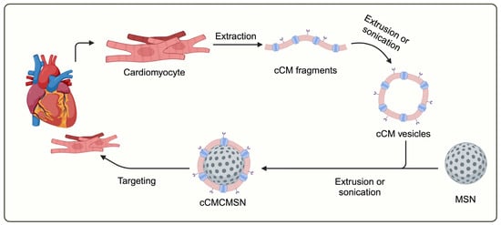 The surface modification by coating NPs with layers of cell membranes (CMs) has been reported [8,11]. Cell membrane-coated NPs (CMCNPs) are a novel type of biomimetic NPs that incorporate cell membranes with engineered NPs for effective therapeutic drug delivery [12]. CMCNPs have been studied in cardiovascular disease (CVD) with cell membranes from various cell types, including red blood cells (RBCs), immune cells (WBCs), platelets, cancer cells, and stem cells [13,14,15,16,17,18]. In a previous study, the therapeutic potential of CMCNPs was demonstrated using mesenchymal stem cell (MSC) membrane-coated mesoporous silica NPs (MSN) to deliver the microRNA-21 (miR-21), reduce the infarct size, and improve cardiac function in mice subjected to a myocardial infarction model [18]. Although the application of MSCs membrane-coated NPs might offer cardioprotection, their lack of specificity for cardiac tissue is apparent. This lack of specificity comes from a non-specificity of stem cells for cardiac cells. Therefore, the utilisation of cardiac cell membrane (cCM)-coated MSNs (cCMCMSNs) (Scheme 1) could provide the specificity for drug delivery to cardiac cells given that cCMs possess unique surface proteins known as homing proteins, which can selectively interact with cardiac cell receptors. These properties could enable specific delivery of therapeutic agents to the heart tissue.