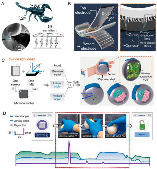 Applications of biomimetic tactile sensors in HMI [193]. (A) Scorpion and its slit sensillum. (B) Biomimetic capacitive sensor with microconvex structures and crack structures. (C) Novelty design ideas for sensor array. (D) Variation in lateral angle, longitudinal angle, and capacitance signal during unlocking process. Copyright 2025, Elsevier.