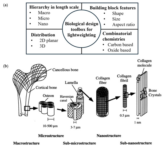 (a) Biological design toolbox (BDT) for functional lightweighting: a modular toolset in biology, (b) pictorial representation for the hierarchical structural design of human bone. Reproduced with permission from Ref. [23].
