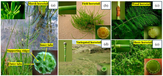 Designs of various horsetail plants showing inner tubes, outer tubes, and supporting ridges, (a) marsh horsetail, (b) field horsetail, (c) wood horsetail, (d) variegated horsetail, and (e) shore horsetail. Reproduced with permission from Ref. [35].