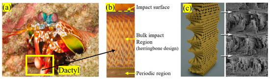 Design of peacock mantis shrimp: (a) shrimp’s dactyl, (b) different dactyl regions, (c) dactyl herringbone design generated from a scanning electron microscopy image of a fractured surface. Reproduced with permission from Ref. [38].