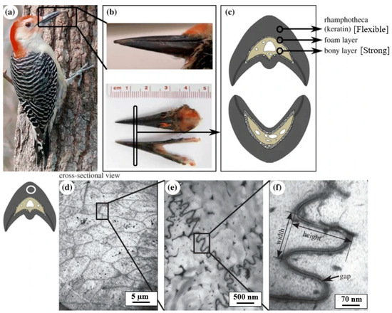Design of the woodpecker’s beak: (a) woodpecker, (b) the beak of the woodpecker, (c) strong and flexible beak region, (d) micrograph of the flexible regions, (e) wavy honeycomb structure, and (f) magnified view of the wavy region. Reproduced with permission from Ref. [15].