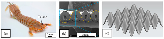 Bioinspired design of shrimp’s telson: (a) shrimp telson, (b) feature identification, (c) inspired design. Reproduced with permission from Ref. [58].