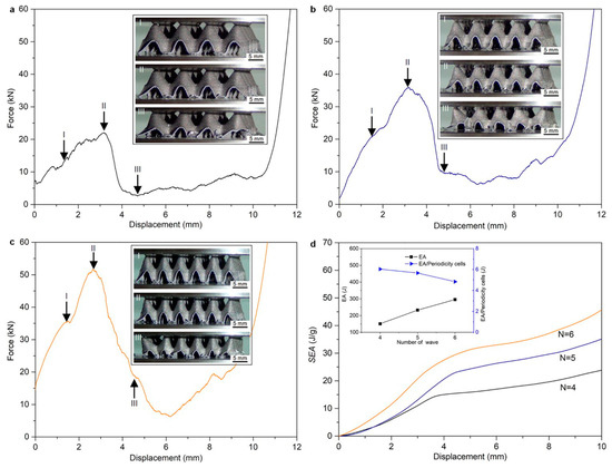 Yang et al. investigated the failure mechanisms of bio-inspired bi-directionally corrugated panel (DCP) structures under compressive loading inspired by the telson of the mantis shrimp, as represented in Figure 14 [41,58]. The study identified wave number (connected to the periodic distribution of a shape in BDT) and wall thickness (as a part of feature size in BDT) as the design parameters. The DCP structures, fabricated using selective laser melting (SLM) with AlSi10Mg powder, were examined for their compressive behaviors, stress distribution, deformation modes, and fracture mechanisms. The experimental variables were thickness: 0.3, 0.4, 0.5 mm and wave number: 4, 5, and 6, while the dimension of the structure was kept constant at 42 × 42 × 12.4 mm3. The force–displacement curves for several tested wave numbers for a constant thickness of 0.4 mm are depicted in Figure 15. The main findings indicate that increasing the wave number (N) resulted in more pronounced structural expansion effects, thereby altering the compressive force–displacement behavior and improving energy absorption efficiency. It is important to note that only the shape of the biological design was used for fabrication, while the size factor of the original biological structures was not utilized.