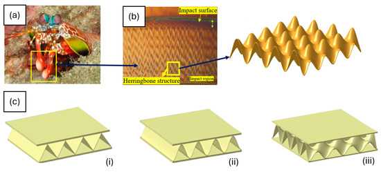 Bioinspired design of mantis shrimp’s dactyl heel: (a) peacock mantis shrimp dactyl heel, (b) feature identification and extraction, (c) designed structures comparing (i) triangular, (ii) single sinusoidal, and (iii) double sinusoidal sandwich structures [59].
