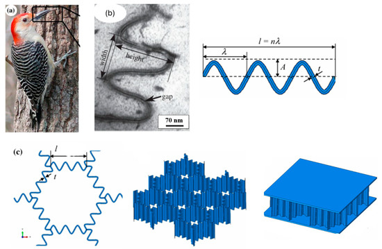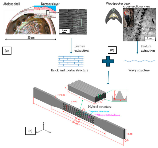 Hybrid bioinspired design inspired by nacre’s shell and woodpecker’s beak: (a) nacre’s shell feature extraction, (b) woodpecker’s beak feature extraction, (c) bioinspired hybrid structure. Reproduced with permission from Ref. [14].