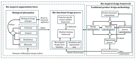 In a different study, Morsali et al. proposed a computational framework combining statistical and machine learning techniques with finite element analysis to create structure–property design strategies for brick-and-mortar composites inspired by nacre [62]. The framework involved testing twenty thousand designs with various feature combinations using finite element analysis to prepare the dataset. Subsequently, a decision tree machine learning model was created to delineate the optimal design space. Calculating the stress–strain responses for the 20,000 FEA models took approximately 50 h, whereas predicting the strength of one million geometries using the machine learning approach required only 6 s with the same computational resources and achieved comparable accuracy. While this highlighted the potential of machine learning algorithms in quickly evaluating the structural properties of many experimental variables, it does not fully couple with the capabilities of manufacturing processes from a systems-level perspective. Ideally, for truly utilizing the vast amount of biological design information for manufacturing engineering products, one must have clear interconnectivity between biological design information, science-driven and AI/ML-based methods/models, and manufacturing/material constraints.