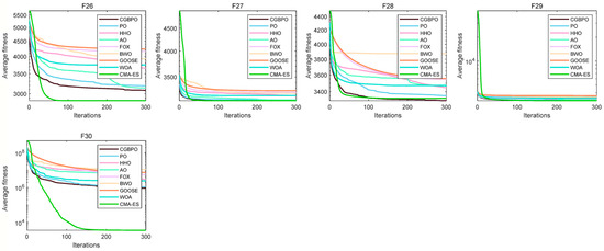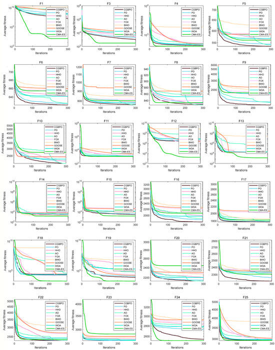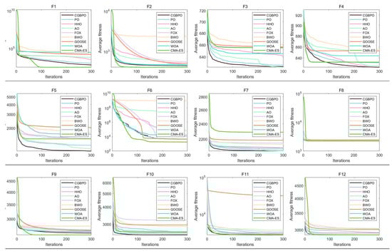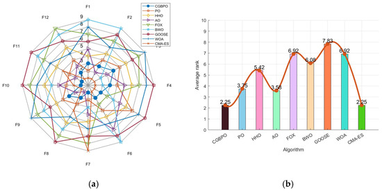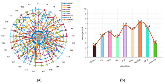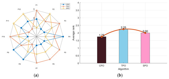 As shown in Figure 1a, the CPO’s radar chart has the least area fluctuation. CPO ranked first for six functions and second for three functions, indicating highly stable results across multiple runs, unaffected by random factors. In Figure 1b, the ranking chart, sorted by average fitness values, shows that CPO has the lowest average fitness value. In the comprehensive test, the CPO algorithm obtained better solutions and outperformed the other two algorithms in convergence performance.