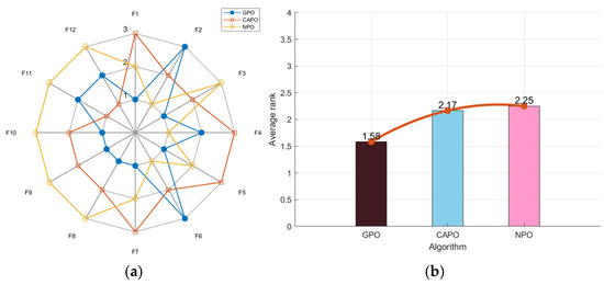 To check the performance of the chosen chaotic strategies, three algorithms—GPO, CAPO, and NPO, which enhance the PO algorithm with Gaussian mutation, Cauchy mutation, and No-uniform mutation, respectively—are used for testing. As shown in Figure 2a, the GPO’s radar chart has the least area fluctuation. GPO ranked first for seven functions and second for three functions, proving its results across multiple runs were highly stable and unaffected by random factors. Notably, GPO had the lowest average fitness value of 1.58 in Figure 2b. In the comprehensive test, GPO performed the best.
