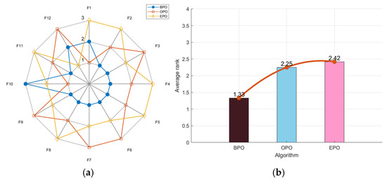 To verify the performance of the chosen opposition-based learning strategies, three algorithms—BPO, OPO, and EPO, which enhance the PO algorithm with barycenter opposition-based learning, traditional opposition-based learning, and elite opposition-based learning, respectively—are employed for testing. As shown in Figure 3a, BPO’s radar chart has the least area fluctuation. BPO ranked first for nine functions and second for two functions, demonstrating that its results across multiple runs were highly stable and unaffected by random factors. Notably, BPO had the lowest average fitness value of 1.33 in Figure 3b. In the comprehensive test, BPO performed the best.