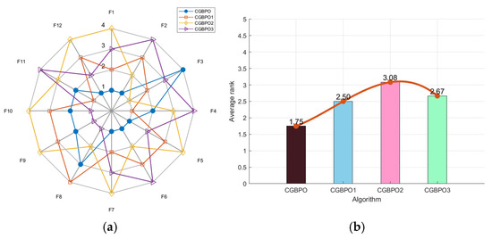 In Figure 4a, CGBPO’s radar chart had the least area fluctuation, ranking first for six functions and second for four. The radar chart areas of the other three algorithms were much larger, showing the positive effects of the three new strategies on algorithm performance. Notably, in Figure 4b, CGBPO had the lowest average fitness value of 1.33 and the best performance in the comprehensive test. In the ranking chart, CGBPO1 ranked second, CGBPO2 fourth, and CGBPO3 third, indicating that Gaussian mutation contributed most to algorithm improvement.