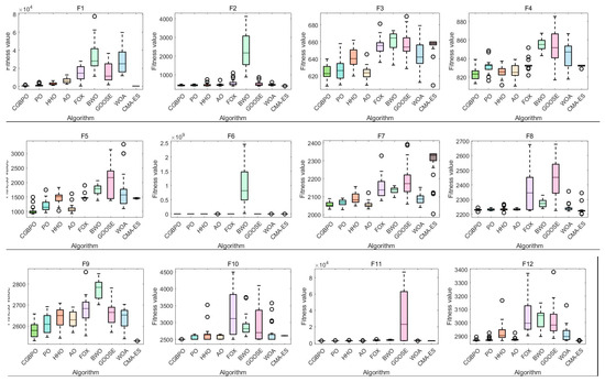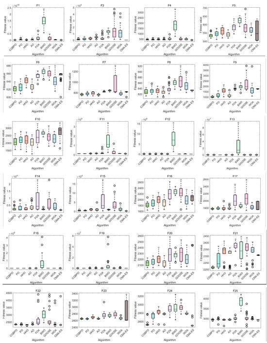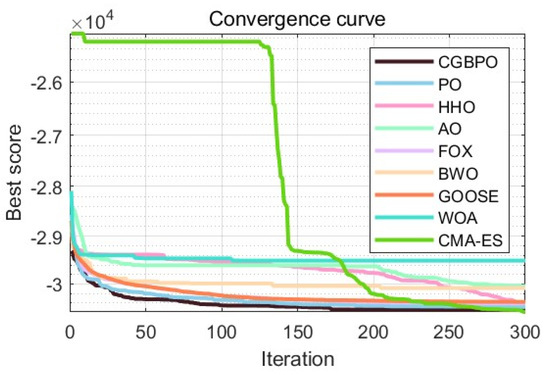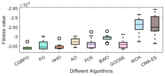 As Table 12 shows, CGBPO achieves a minimum value of −30,665.4, the lowest among compared algorithms. Regarding std and avg values, CGBPO outperforms its counterparts. From Figure 16 and Figure 17, CGBPO has the fastest convergence speed when optimizing functions, obtaining the optimal solution earliest, showing the best stability, and having the highest solution accuracy.