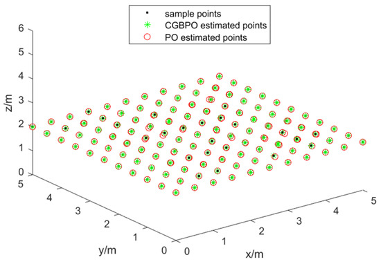 To test the positioning error of CGBPO, at a height of 2 m, signal receivers are placed every 0.5 m in the 5 m length and 5 m width directions, creating 121 test points. A positioning-simulation experiment is conducted using MATLAB, and the experiment’s relevant parameters are set as shown in Table 13.