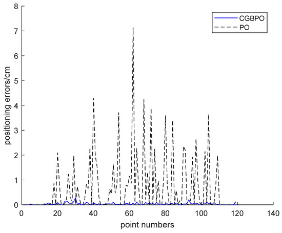 Figure 19 presents the error curves of the estimated positions for the two algorithms. Clearly, among the 121 test points, CGBPO has the smallest error in estimated positions, while PO shows relatively larger errors at each test point.