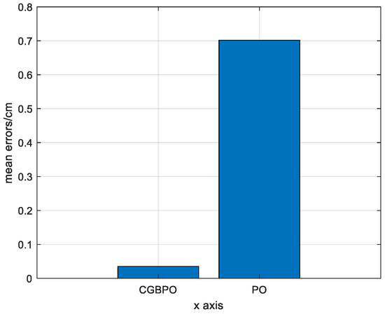 Figure 20 is a bar chart of the average errors of the estimated positions for the two algorithms. By comparison, the average error of PO’s estimated positions is about 0.0070 cm, while that of CGBPO is about 0.00034807 cm. The CGBPO algorithm shows the most stable positioning performance.