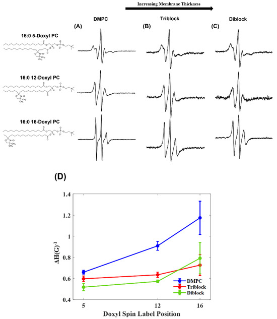 A trend was also seen between the liposomes and the polymersomes. Differences in lineshape and linewidth were observed between DMPC liposomes, triblock polymersomes, and diblock polymersomes. As the membrane thickness increased, so did the linewidth of the CW-EPR spectra. This increase in membrane thickness also increases the lateral pressure in the bilayer, which would cause the spin label to have more rigid motion, resulting in broader peaks in polymersome samples. In order to quantify the broadening in the spectra, the inverse central linewidth was calculated from the CW-EPR spectra shown in Figure 1A–C. The inverse central linewidth gives a quantitative measure of the side-chain mobility of the spin label [42]. Figure 1D shows an increase in the inverse central linewidth value the further the spin label is positioned into the membrane, indicating a sharper peak in the spectra.