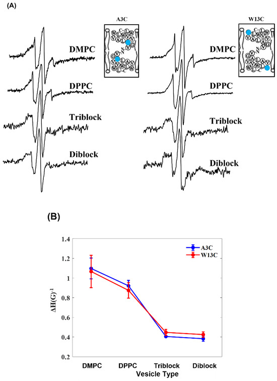 Slight peak broadening was observed in the spin-labeled gramicidin A EPR spectra in DMPC and DPPC spectra. Both lipids are fully saturated, but DMPC has a shorter acetyl chain length. The triblock polymersome and diblock polymersome spectra exhibited significant lineshape changes when compared to the liposomes. Previous studies have shown that thick block copolymer membranes will either contract around the incorporated membrane protein or arrange smaller block copolymer chains around the protein while longer chains surround it to stabilize the membrane [36]. This would explain the differences seen in the spectra as a compressed membrane around the membrane protein would likely cause additional spin-label-restricted motion, resulting in linewidth broadening. There is also slight line broadening observed between the triblock and diblock polymersome samples, which can be attributed to the thicker membrane and higher lateral pressure in the diblock polymersomes [34]. This broadening is quantified in Figure 2B. The inverse central linewidth is plotted for each vesicle type in both mutants. This value decreases as the membrane thickness of the vesicle increases, indicating peak broadening in the spectra as the membrane thickness increases.