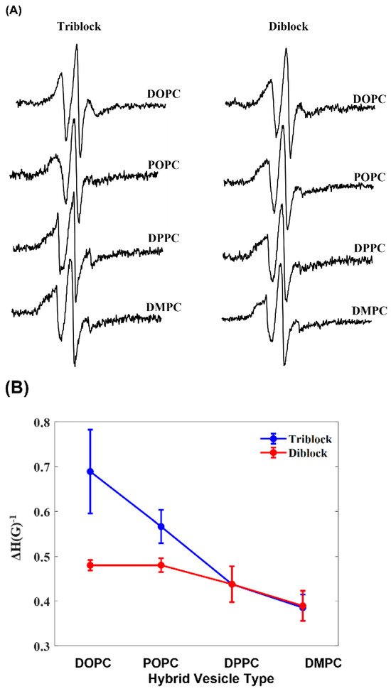 The differences seen between the polymersome and hybrid vesicle EPR spectra could be due to the differences in the composition of the systems. Broader peaks were seen in the pure triblock and diblock polymersomes compared to the hybrid vesicles made with the same block copolymers. Statistically, the hybrid vesicles are variable in composition, with there being a random distribution of lipids and block copolymers within each vesicle. There is also the random chance of some vesicles being composed of 100% lipid or polymer. Although it is expected that hybrid vesicles have more pressure within the membrane, due to the differences in the thickness of the hydrophobic core of lipids and block copolymers [16], the random distribution of not only the lipids and polymers but also the incorporation of the peptide could cause differences in peak broadness. Our results show larger error bars on the inverse central linewidth (ΔH−1) plots for the samples that have a narrower EPR spectral linewidth when compared to the samples that have a broader linewidth. This variation in the error bars may be due to the fact that the spin-labeling sites for these samples are more dynamic and more flexible, causing variation in the stability of the lipid complex. Another contribution may be due to the characteristic of EPR spectral measurements at different linewidths [43]. Contributions might also be due to different lipid saturation levels and different lengths of the carbon acyl chain of the lipid causing variation in the stability of the lipid vesicles. Also, the variation in the sample preparation quality for different lipid samples may have contributed to the variation in the error bars.