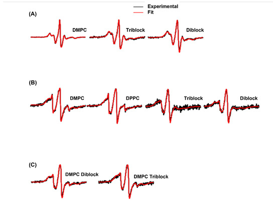 EPR spectral simulation for (A) 16:0 5-doxyl PC spin-labeled lipids in DMPC, triblock, and diblock vesicles; (B) gramicidin A mutant A3C incorporated into DMPC, DPPC, triblock, and diblock vesicles; (C) gramicidin A mutant A3C incorporated into hybrid vesicles composed of DMPC/triblock and DMPC/diblock. Experimental data are in black and the fitted data are in red.