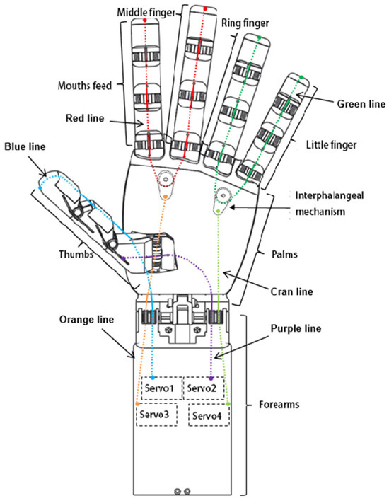 The tendon rope drive can greatly simplify the design complexity of the dexterous hand and can provide enough space for the pressure sensor to be mounted and alignment space. The overall transmission scheme of the dexterous hand is shown in Figure 2. The colored lines indicate the arrangement of the tendon ropes in the dexterous hand. The bending motion of the thumb is controlled by Servo 1, and a tendon rope (blue line) passes through the DIP and MCP joints of the thumb and connects directly to the output of Servo 1. The side-swinging motion of the thumb is controlled separately by servo 2, by a tendon rope (purple line) passing through the CMC joint of the thumb and connecting directly to the output of servo 2. The bending motion of the index and middle fingers is controlled by the servo 3 linkage, and the index and middle fingers are connected in series by a tendon rope (red line), and the roots of the two fingers pass through the differential mechanism in the palm, which balances the tension of the tendon ropes on the two fingers to realize the synergistic adaptive motion of the two fingers. The input of the differential mechanism is connected to the output of the servo 3 by another tendon rope (orange line). The bending motion of the ring finger and the little finger is linked and controlled by the servo 4. The ring finger and the little finger are connected in series by a tendon rope (green line), and the roots of the two fingers pass through another differential mechanism in the palm, which balances the tension of the tendon ropes on the two fingers to realize the synergistic adaptive motion of the two fingers. The input of the differential mechanism is connected by another tendon rope (cyan line) to the output of the servo 4.