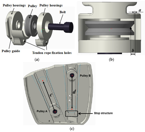 In addition to the movement of a single finger, underactuation is also extended to multiple fingers, i.e., a single actuator is used to drive the movement of multiple fingers, again requiring a drive with adaptive characteristics. The driving force needs to be evenly distributed to each linked finger so that when the motion of one or more fingers is blocked, the remaining fingers continue to be driven. Introducing underactuation between fingers can further reduce the complexity of the system. Differential mechanisms that have been applied in dexterous hand research are moving pulleys [29], differential linkages [30], and differential gear [31]. In this paper, the moving pulley is used as a differential structure between fingers. The moving pulley has no limitation on the differential stroke, but the key rope is easy to lose and fall off in practical applications, so in this paper, a specific structure is used in the design to fix the trajectory of the moving pulley and to avoid the problem of the tendon rope falling off from the moving pulley, as shown in Figure 4. The pulley shell parameters are a = 0.35 mm, b = 1.1 mm; the effective travel of pulley A is c = 44 mm; and the effective travel of pulley B is d = 50 mm.