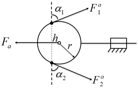 Based on the designed movable pulley structure, the force transfer sketch of a single movable pulley differential mechanism is established as shown in Figure 5, so as to obtain the relationship between the driving force and the tendon rope tension. The circle in the figure represents the moving pulley, which has two degrees of freedom of motion in the designed differential structure, which are translational motion along the pulley guide and rotational motion around the pulley axis. One end of the moving pulley is connected to the actuator, which is recorded as the input end, ignoring the friction, the input of the differential mechanism is the output force of the actuator. The other end of the moving pulley is recorded as the two outputs, which are connected to the two fingers, and the two output forces are and . The radius of the moving pulley is r. , denote the angle between the input and the output, respectively. denotes the distance between the two tangent points of the tendon rope and the pulley at the output end, and according to the geometric relationship, we can obtain