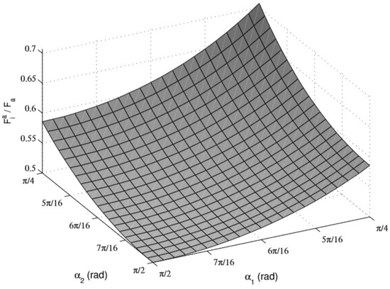 From the above analysis, it can be seen that in the case of a fixed moving pulley trajectory, ignoring the effect of friction, the two outputs of the moving pulley differential mechanism are always equal. The relationship between input and output is determined by the tendon rope angle , , which is non-linear. Figure 6 shows a surface plot of the dynamic pulley transmission ratio versus the tendon rope clamp , .