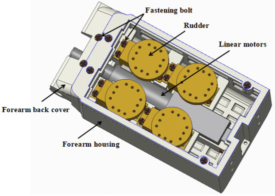 A wrist flexion joint is designed at the wrist as shown in Figure 8. The wrist joint is driven by a linear motor using a linkage drive, and the power is transmitted through a simple crank-rocker mechanism, which converts the reciprocating linear motion of the linear motor into the bending and straightening motions of the wrist, respectively. The forearm is designed to reduce the size as the main design principle, the distance from its bottom to the wrist rotation axis is 110 mm, the width is 61 mm, the height is 51 mm, and the installation of the servo and the linear motor is shown in Figure 9. The Servo model is the GDW CLS, RS0707-270°, and Table 9 shows the dimensions and performance of this servo. The servo weighs 20 g, provides 270° of turning angle and 0.75 of torque, and is small in size and low in cost.